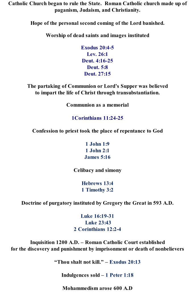 The following Bible study was reproduced from an  un-copyrighted outline of church history. The First Church -- Apostolic 33-100 A.D.	  Founder:  Jesus Christ		-- 	Place: Jerusalem “One Lord, One Faith, One Baptism” Falling Away Period 100-325 A.D. Dark Ages -- Corruption 325-1517 A.D. Reformation 1517-1720 A.D. Bible Studies Acts 2:38 Lady - Home