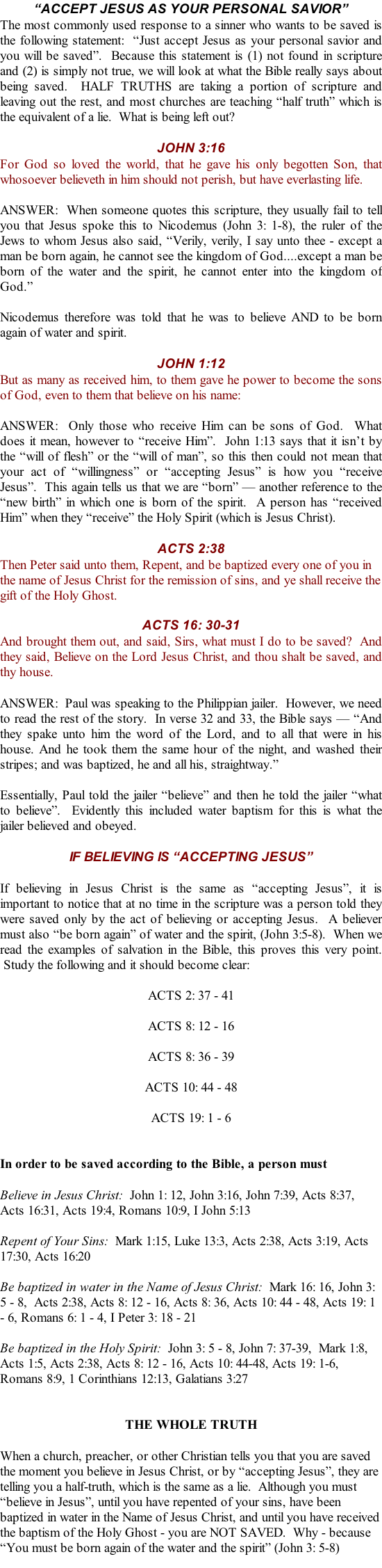 SALVATION IN A NUTSHELL    THE WHOLE TRUTH  ACCEPTING JESUS AS YOUR PERSONAL SAVIOR  AND   BEING BORN AGAIN   Written by Pastor Paul Davis Bible Studies Acts 2:38 Lady - Home